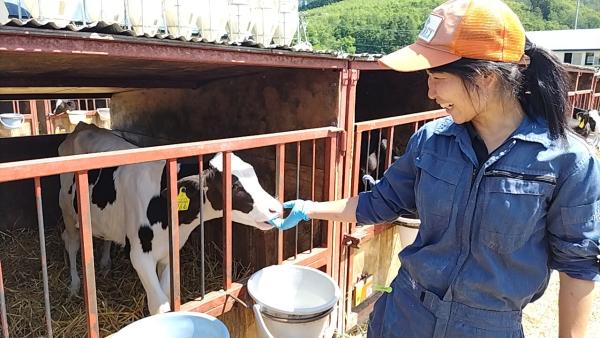 今は仔牛にミルクをあげる仕事を任されていて、癒されながら働いています。動物が相手の命を育てる仕事なので、些細な変化も注意しながら気を付けています。また、みんなが働きやすいようにコミュニケーションを大切にしています。